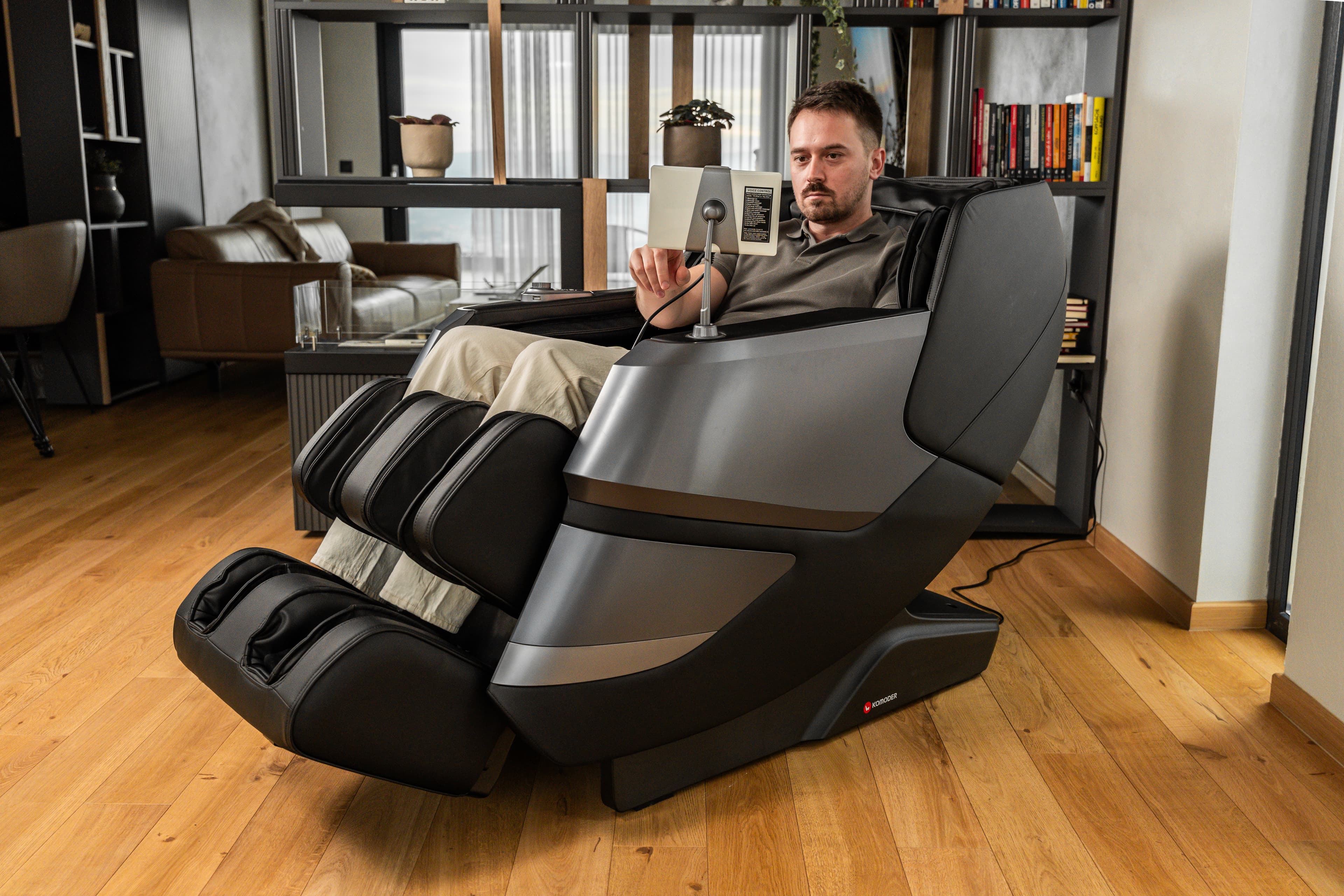 El nuevo sillón de masaje Focus III simula 6 técnicas de masaje y ejecuta 15 programas de masaje automáticos. El masaje de presoterapia se realiza con 24 airbags y, para mayor comodidad, el sillón está equipado con altavoces, bluetooth, tablet, comandos de voz y un innovador sistema de calefacción.